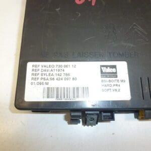 Le module BSI Valeo SYLEA BOÎTE M2 est une pièce essentielle pour les véhicules PSA Citroën et Peugeot, identifié par les numéros de référence 9642409780 et 73006112. Ce module électronique centralise et gère les fonctions de confort et de sécurité du véhicule, telles que l’éclairage, les fonctions des portes, la gestion des verrouillages et autres commandes électroniques.